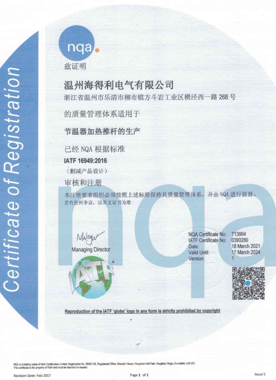 海得利電氣公司是集科研、開發(fā)、生產(chǎn)、銷售為一體的大型綜合性民營(yíng)企業(yè)。公司專業(yè)生產(chǎn)節(jié)溫器加熱推桿、熱流道加熱器、單端加熱元件、真空半導(dǎo)體加熱器等各類加熱器,產(chǎn)品廣泛應(yīng)用于汽車、半導(dǎo)體、軍工、模具、動(dòng)車、食品、醫(yī)療、通訊、家電等各個(gè)領(lǐng)域,致力于將品牌以更多樣化的形式進(jìn)行推廣,將服務(wù)與產(chǎn)品以更高效、更便捷、更優(yōu)質(zhì)的方式服務(wù)每一個(gè)客戶。